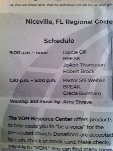 After a happy and delightful ride with Hannah Grace to Camp Victory and getting her settled in, I went to a Voice of the Martyrs conference at Rocky Bayou Baptist Church in Niceville, FL. The Voice of the Martyrs is a non-profit, inter-denominational Christian organization dedicated to assisting the persecuted church worldwide. Their website is www.persecution.com. Once again, this is kind of a cheat. I've been to VOM conference once before. I've never been to Rocky Bayou Baptist Church before. I've been to lots of Baptist churches though, so that's kind of a cheat as well. And I drove through Mossy Head, Florida on the way which I don't remember doing before. Just driving through a town really can't qualify as a "first." Hey, wait a silly minute. This is my blog. I can sum all of those up and count it as a "first." Maybe the blog police won't find out.
